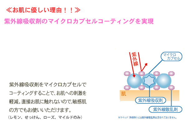 場所を選ばず化粧の上から塗り直しも簡単。また「SPF50+、PA+++」(マイルドのみSPF30、PA++)のサンブロック強度に加え、肌を痛める原因ともなる紫外線吸収剤をマイクロカプセルコーティング(アロマクール、無香料除く)することで敏感肌の方にもお使いいただける仕様になっております。