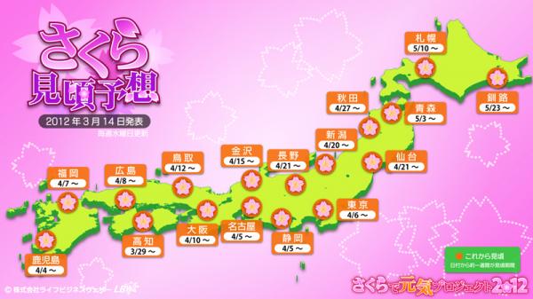 開花のトップは、高知の3月21日で、あと1週間といったところです。一方、東京の予想開花日は前回より3日遅くなって、3月31日です。東京都心部で一番の見頃となるのは4月7~8日の週末前後と予想されます。入学式に花を添えそうです。桜前線のみちのく入りは、福島県いわき市で開花する4月13日。それから約半月をかけて東北地方を北上し、ゴールデンウィークは東北北部で見頃を迎えるでしょう。