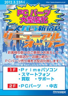 全国24店舗及びウェブ通販のパソコンショップ『ドスパラ』を運営する株式会社サードウェーブ(代表取締役 : 尾崎健介、本社 : 東京都千代田区)は、2012年3月23日(金)、新宿地区の二店舗のうち『ドスパラ 新宿2号店』を『ドスパラ 新宿店』に統合集約、リニューアルオープンすることを発表いたします。