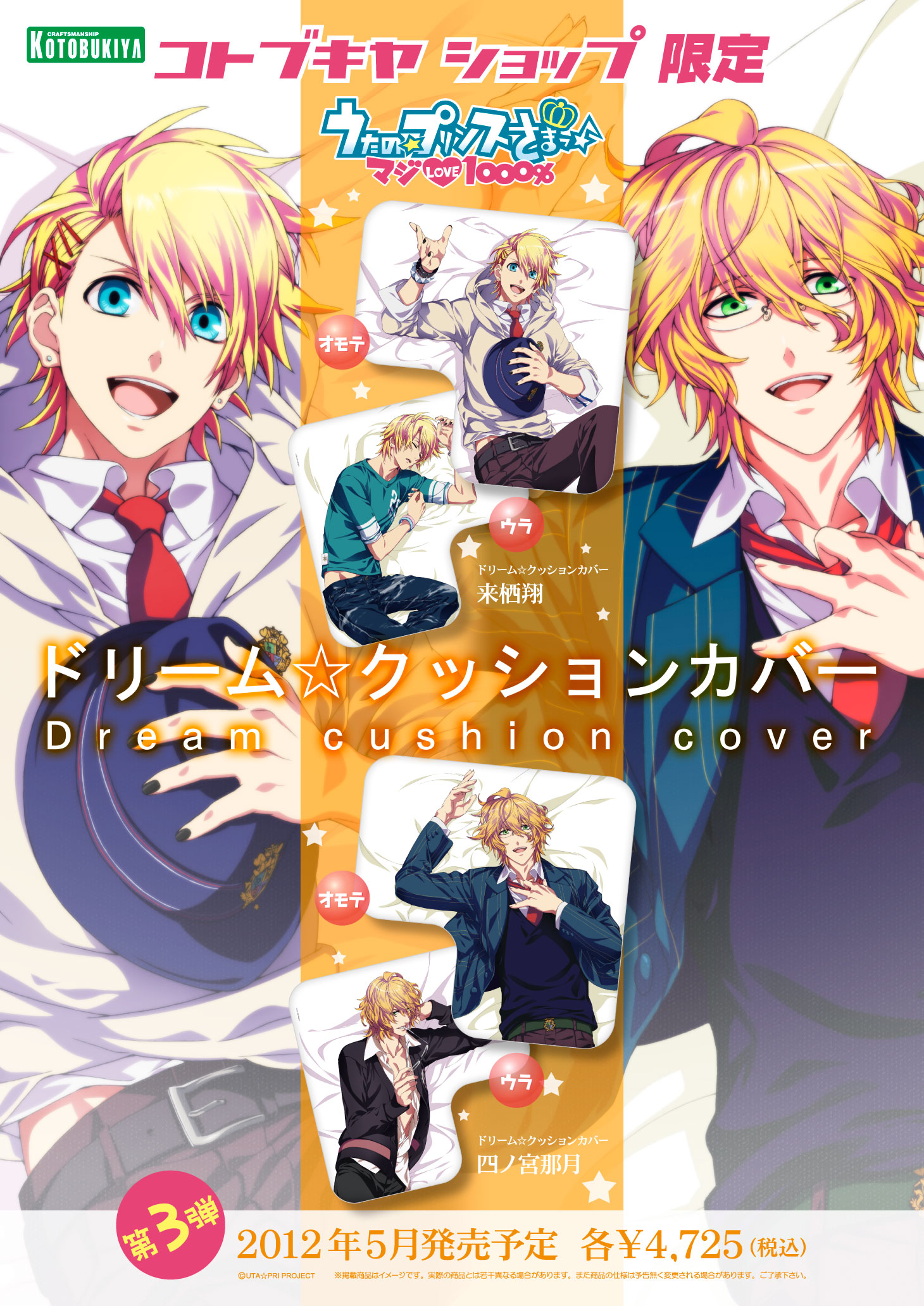 ホビーメーカーコトブキヤ(本社:東京都立川市曙町/ 代表:清水 一行)の「esシリーズ」より発売されている「ドリーム☆クッション」シリーズに、大ブレイクしたアニメ「うたの☆プリンスさまっ♪マジLOVE1000%」が登場。「ドリーム☆クッション」とは、魅力的な男性に腕まくらをしてもらえる!?をコンセプトにした L字型のクッションである。コンセプトに基づき、頭部を置く部分にはちょうど腕が来るようイラストを配置。カバーの裏と表で全く違う雰囲気を表現した。