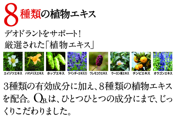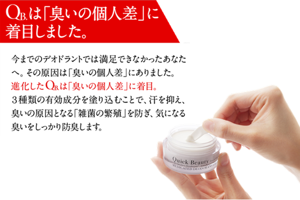 そこでQBは今までのデオドラントケアでは満足できなかった方の原因として、「臭いの個人差」に着目。幅広いユーザーの方にご満足いただけるよう、殺菌成分配合量を従来の2倍にし3種類の有効成分を塗りこむことで、汗を抑え、ニオイの原因となる雑菌の繁殖を防ぎ、気になるニオイをしっかり防臭します。