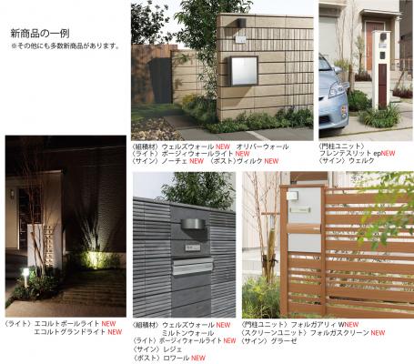今回の新商品は、選んで組み合わせて、自分好みのスタイルで自在に描ける門柱・門まわり・スクリーンユニット〔フォルガシリーズ〕、電気自動車の充電ユニットを搭載した機能門柱〔フレンテスリットep〕、「プレミオシリーズ」との組み合わせでデザインの幅を広げるシンプルな意匠のコンクリート組積材〔ウェルズウォール〕、12ボルトの低電圧LED照明〔エコルト〕、引き出しのように郵便物を取り出す埋込みポスト〔ロワール〕、その他にも表札や立水栓に多数新商品が加わり、多彩なラインナップになっています。