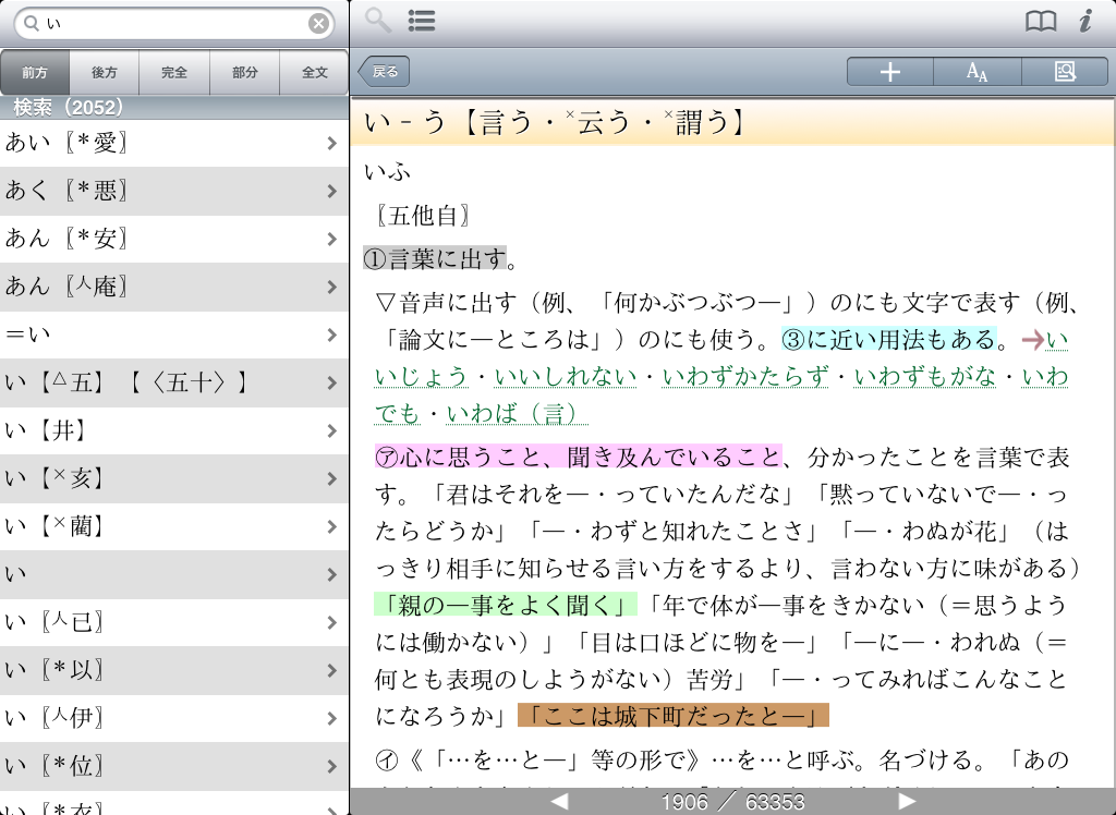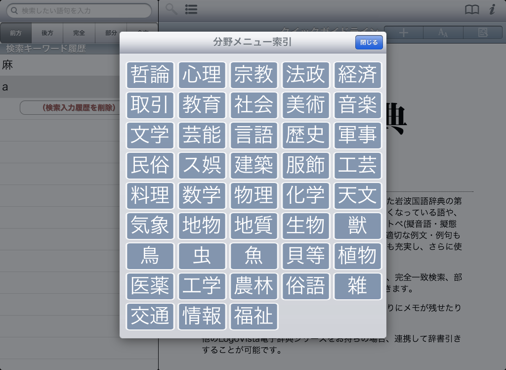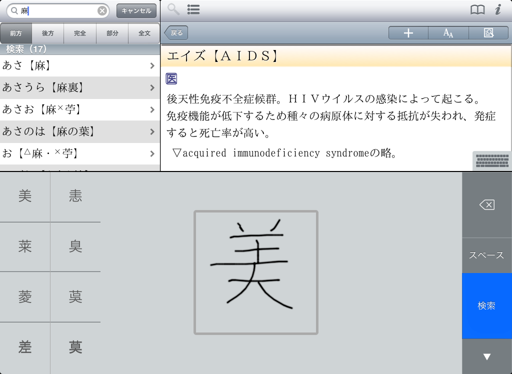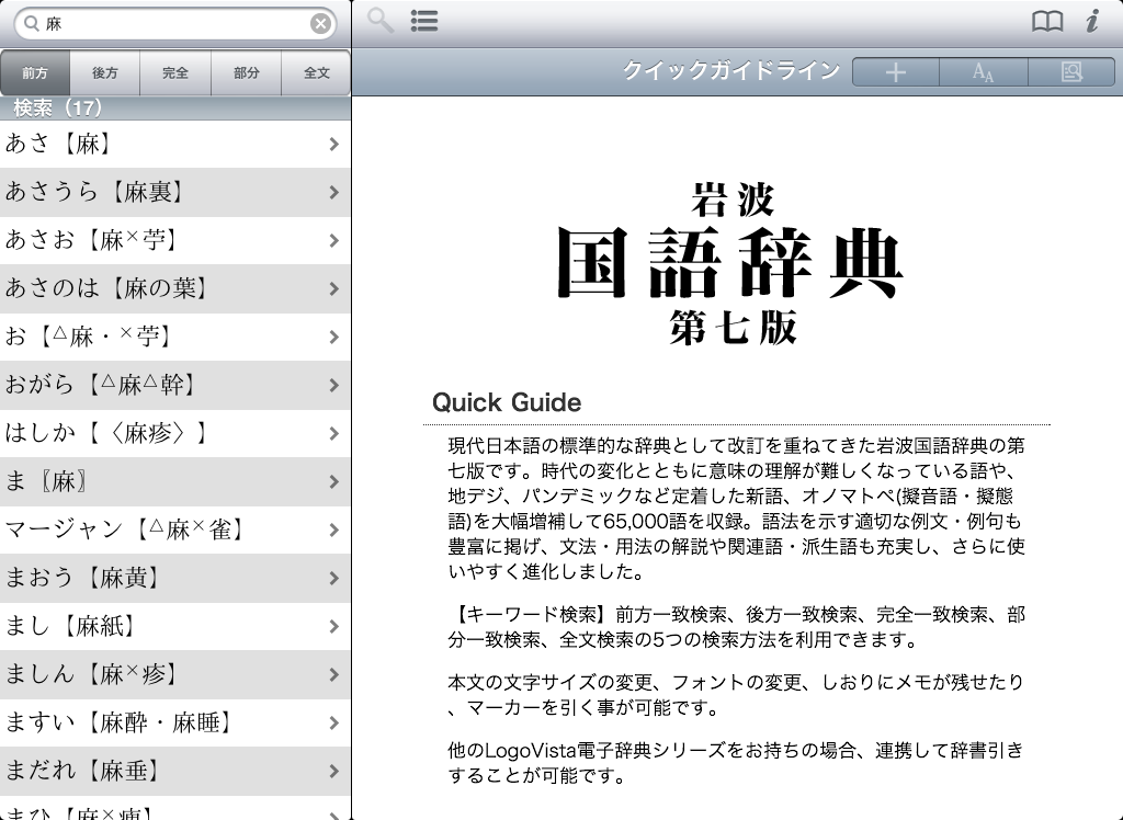 ●豊富な検索オプションを用意(前方一致 / 後方一致 / 完全一致 / 部分一致 / 全文検索)。それぞれの検索方法で、文字を入力すると候補見出し語が表示されるインクリメンタルサーチに対応。(部分一致、全文検索を除く)用語をうろ覚えでも検索が容易です。