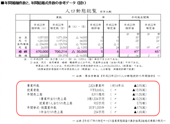 2011年の婚姻件数はおよそ67万組(厚労省 2011年 人口動態統計)。年間結婚式件数はおよそ35万組(経産省 2005年 サービス産業実態調査)と言われ、婚姻者の約半数近くがナシ婚(*入籍はするが、挙式・披露宴を行わない)層と言われています(図1参照)。