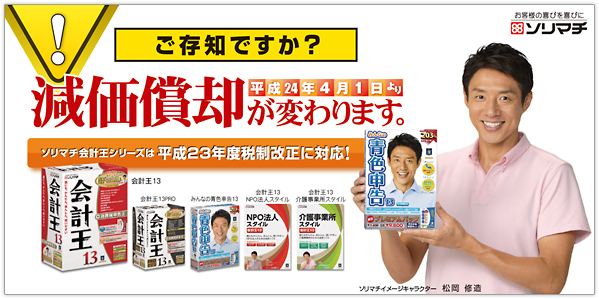 業務ソフト「会計王シリーズ」を提供するソリマチ株式会社(本社:東京都品川区、代表取締役社長:反町秀樹、以下ソリマチ)は、現在発売中の「会計王13シリーズ」において4月1日から施行される減価償却制度の200%定率法や改正消費税法に対応したサービスパックを平成24年3月30日(金)より提供いたします。