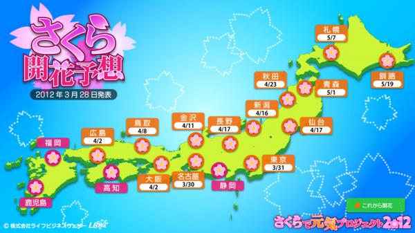 西日本の太平洋側を中心に開花ラッシュが始まりました。桜前線は来週週明けにかけて太平洋側から北上し、東京の開花は3月31日の予想です。全般に平年より5日前後遅く、大阪は4月2日と7年ぶりに4月の開花となりそうです。また、4月上旬も寒の戻りが予想されるため、満開までは一週間以上かかり、今年は例年に比べて幾分長く桜が楽しめるでしょう。