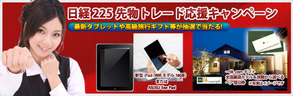 この度、当社では、日経225先物取引の売買枚数に応じて最新タブレット端末や高級旅館ギフト券などが当る「日経225先物トレード応援キャンペーン」を実施いたします。