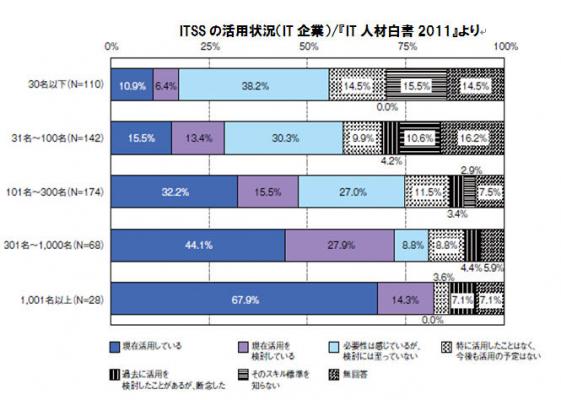 独立行政法人 情報処理推進機構(IPA)の発行する『IT人材白書2011』によると、大手IT企業では活用が進んでいる「ITスキル標準」が、中堅・中小企業では未だ活用が進んでいない現状が報告されています。
