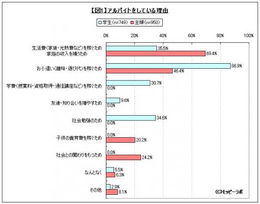 アルバイト経験のある10~50代の男女に対して「アルバイトをしている理由」についてモバイルリサーチで聞いたところ、学生の場合は1位「お小遣いを稼ぐため」(86.9%)、2位「生活費を稼ぐため」(35.5%)、3位「社会勉強のため」(34.6%)と9割近くが「自分自身」のお小遣いのためという結果となった。一方の主婦の場合は、1位「家庭の収入を補うため」(69.4%)、2位「お小遣いを稼ぐため」(46.4%)、3位「社会との関わりをもつため」(24.2%)と7割近くが「家庭」のためのアルバイトであるという結果となり、属性によってアルバイトの目的がまったく異なることがわかった。また、学生・主婦の共通点として「社会勉強のため」(34.6%)「社会との関わりをもつため」(24.2%)という回答のように「社会」との接点をアルバイトに求めていることも明らかとなった。