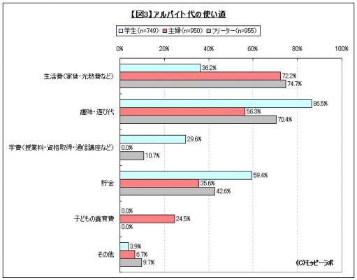アルバイト経験のある10~50代の男女に対して「アルバイト代の使い道」についてモバイルリサーチで聞いたところ、主婦・フリーターでは7割以上が「生活費」と回答し、生計を立てることをもっとも優先した結果となった。一方の学生では1位「趣味・遊び代」(86.5%)、2位「貯金」(59.4%)と生計を立てるためではなく、日々の生活をより充実させるための項目に使われていることがわかった。