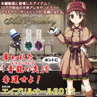 エイプリルオールは、2010年から便乗させていただいている弊社のエイプリルフール企画で、今年で3回目を迎えました。今年は、弊社が運営する「間違い.net」と「オールジュエリー」の連動企画とし、2012年4月1日(日)にエイプリルオール2012、【怪盗エイプリルオール・奪われた「青龍の炎(ドラゴンフレア)」を奪還せよ!】を開催しました。当日は、同社の会社ホームページのトップページを全面ジャック、オリジナル動画をYouTubeにて公開し、たくさんのアクセスをいただくことができました。