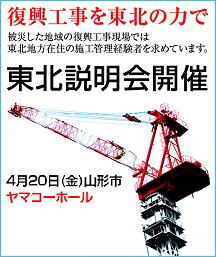 内容: 東北の震災復興関連工事を中心とした、施工管理の求人案内と募集、面談。また、協力希望の企業向け事業案内。