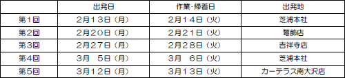 具体的な活動は、昨年同様、宮城県石巻市にてNGOピースボート※のコーディネートのもと、漁業支援活動等を行う予定。往復の交通手段や必要装備の一部を会社が用意するとともに、厳冬期対策として防寒具も用意する。