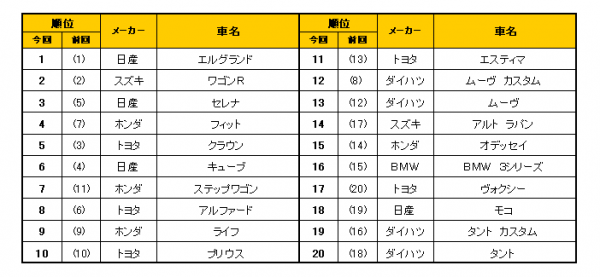先月5位だったセレナが3位に浮上し、先月3位だったクラウンは5位へ。