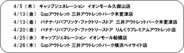 4月5日にギャップジェネレーション イオンモール久御山店をオープンするのを皮切りにして、13日にはGapアウトレット 三井アウトレットパーク木更津店とバナナ・リパブリックファクトリーストア 三井アウトレットパーク木更津店、4 月20 日にはバナナ・リパブリック りんくうプレミアムアウトレット店、4月25日にはギャップジェネレーション イオンモール船橋店、そして4月26日にはGapアウトレット三井アウトレットパーク横浜ベイサイド店をオープンします。