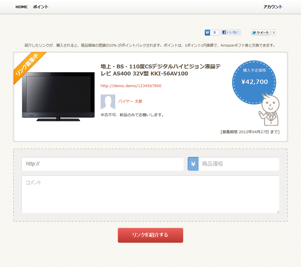 作成された「リンク募集」を見た、facebook 上のお友達や、リンクバイヤーのユーザーが、あなたの代わりに、もっと安く購入できるネットショップを探し、リンク(URL)を紹介してくれます。