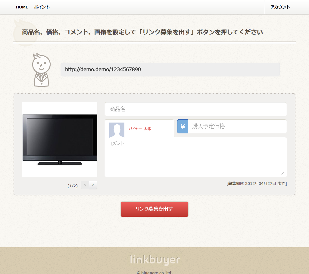 リンクバイヤーに、購入予定の商品のURL、商品名、販売価格を入力すると、「リンク募集」が作成されます。