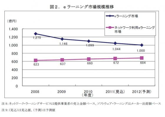本調査における「eラーニング市場」とは、「ネットワークとパソコンを利用した学習形態」のみならず、携帯ゲーム機、携帯電話(スマートフォン含む)、携帯型デジタル音楽プレイヤー、学習用ソフトウェア(ゲームも含む)、衛星通信等を使用した学習形態を含めている(広義のeラーニング市場)。