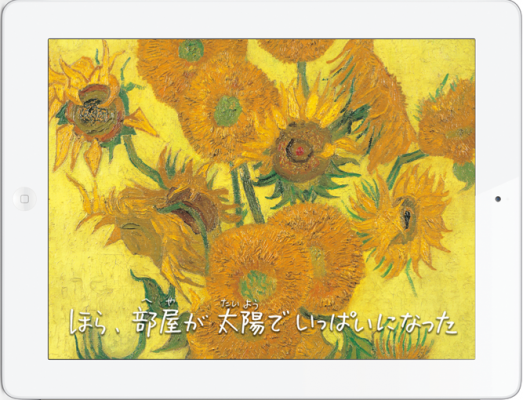 累計70万部を超えるロングセラー絵本「小学館あーとぶっくシリーズ」から楽しいiPadアプリが生まれました! 印象派の5人の画家(モネ、ルノワール、ゴーギャン、スーラ、ゴッホ)の描いた名画1枚ずつを「小学館あーとぶっくシリーズ」著者・結城昌子さんが書き下ろした小さなお話でナビゲートします。