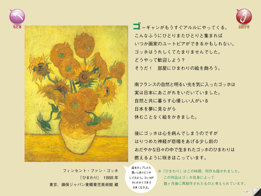 ※このアプリは各画家の名画ごとに5つの章からなっていて、アプリをダウンロード後にゴッホの『ひまわり』の章のみ無料で閲覧できます。その他のすべての章を閲覧するにはアプリ内での有料決済(500円)が必要となります。
