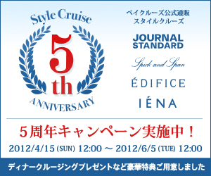 「Style Cruise|スタイルクルーズ(http://style-cruise.jp/)」にて、4月15日(日)から、これまでご支持いただきましたお客様への感謝の気持ちを込めて、5周年キャンペーンを開催します。豪華ディナークルーズプレゼントや、5大特典を用意してお待ちしております。ぜひこの機会にスタイルクルーズで、お買い物をお楽しみください。