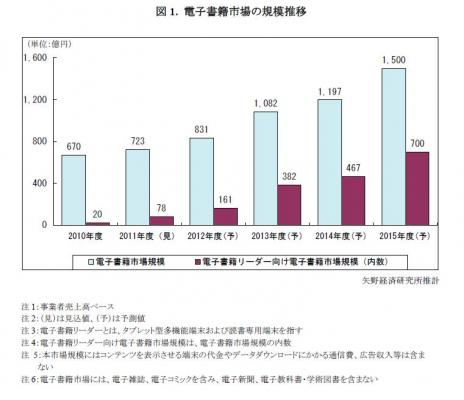 本調査における電子書籍市場とは、PC・PDA向け、携帯電話・スマートフォン向け、タブレット・電子書籍リーダー向けに配信される電子書籍(電子雑誌、電子コミックを含め、電子新聞および教科書、学術図書を含めない)のコンテンツを事業者売上高で算出したものである。コンテンツを表示させる端末の代金やデータダウンロードにかかる通信費、広告収入等は含めない。