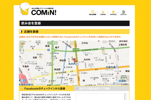 COMIN!(カミン!)は、Facebookとスマートフォンを利用したWEBサービスで、自分が飲んでいる場所や人数などをGPSやFacebookとの連携を基軸として飲み会の情報を登録し、そこへ特定の人間を誘うことや、自由(条件付きも可)に参加者を募ることができる環境を設けることで、企画した飲み会を更に有意義なものへと変化させる可能性があります。