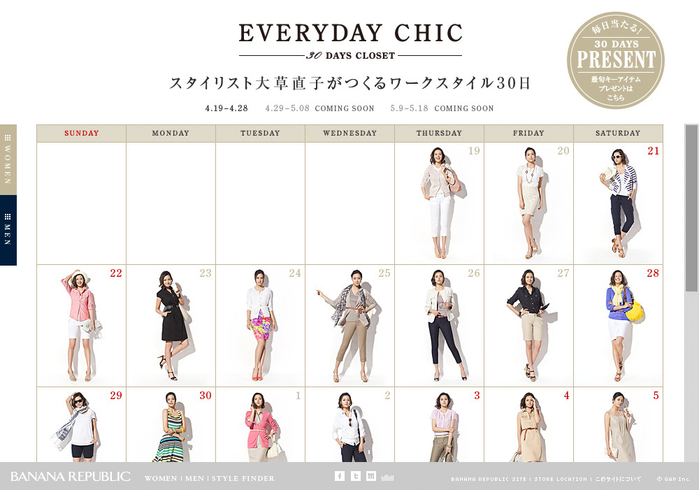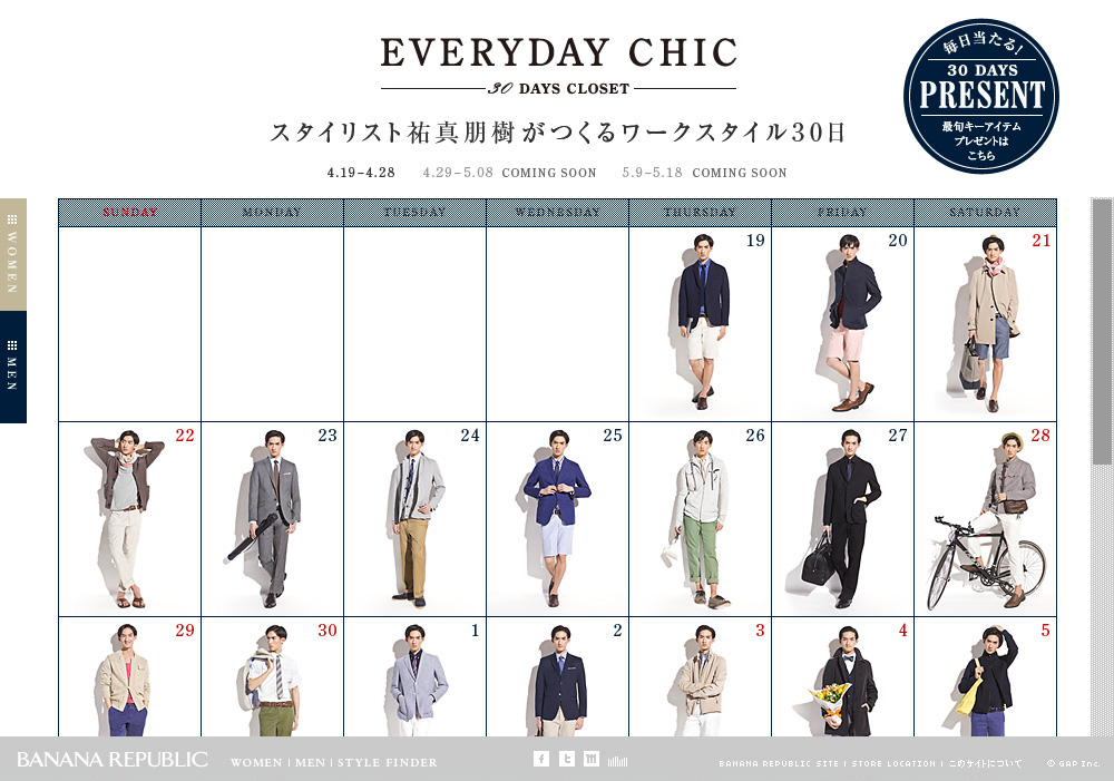 スタイリスト祐真朋樹氏と大草直子氏がバナナ・リパブリックでつくる30日分のスタイルを、メンズ・ウィメンズそれぞれ毎日1体ずつ、キャンペーンサイトにて紹介していくもので、ウィークデイからウィークエンドまで、様々なシーンを想定したスタイルが毎日更新されるので、30日間通して楽しむことができます。