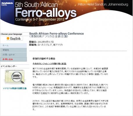 株式会社グローバル インフォメーションでは、皆様の利便性を図る為に、日本語、韓国語、中国語で「5th South African Ferro-alloys Conference (第5回南アフリカ合金鉄会議)」の情報を提供するとともに、会議の参加のお申し込みを承っております。