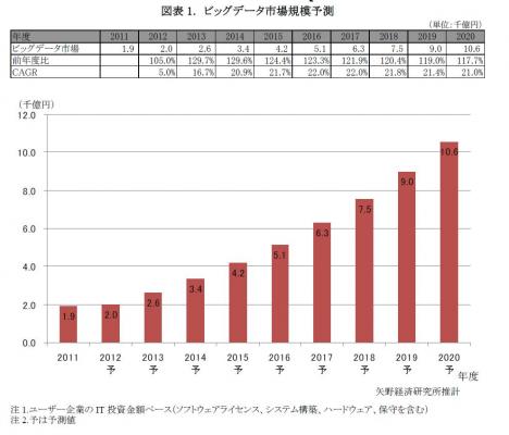 (1)非常に大容量であるため処理や分析に特別な技術を要するデータ、(2)データベース、文書、音声、映像などを含む多様な種類のデータ、(3)極めて高頻度で発生し超高速に処理されるデータ、の三要素を含むデータを総称する。ビッグデータ市場は、ユーザー企業がビッグデータの蓄積・処理・分析に投ずる費用の全てとする。