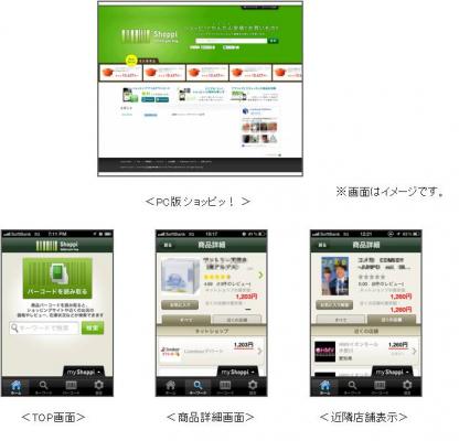 2010年6月よりサービス提供している「ショッピッ!」(http://shoppi.jp/)は、手にした商品のバーコードを「ピッ!」と一瞬で読み取ることで、価格などの商品情報を取得し、その場で楽天市場やYahoo!ショッピング、Amazon.comをはじめとした、最大40のECサイト(登録店舗数:約6万店舗)から比較・購入ができるスマートフォン向けのお買いものアプリです。