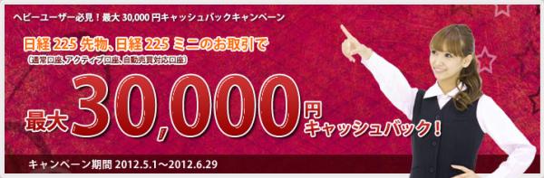 この度当社では、日経225先物取引に関して、期間中のお取引量に応じてキャッシュバックを行う『ヘビーユーザー必見!最大30,000円キャッシュバックキャンペーン』を平成24年5月~6月末まで実施致します。