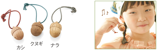 商品概要: カシ、クヌギ、ナラで作った3種類の木の鈴。それぞれの樹種のどんぐりの形をデザインしました。飛騨高山の
