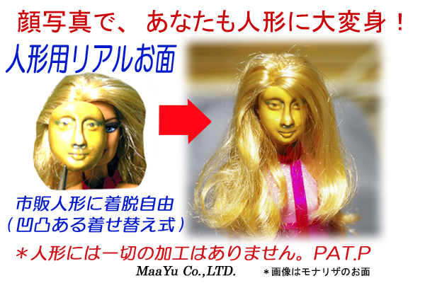 人形の顔に、普通のお面の様にかぶせるだけで人形が、あなたに変身します。