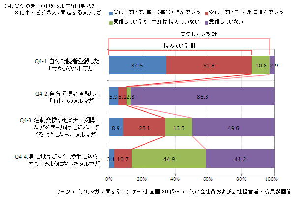 Q4. . 仕事やビジネスに関連するメルマガについて、受信の“きっかけ”別開封状況(それぞれ単一回答)