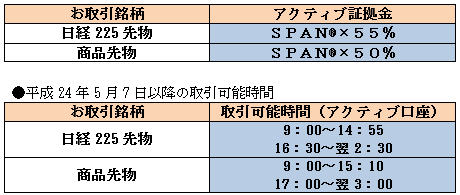 この度当社では、リリース以来お客様よりご好評を頂いております「日経225先物取引」及び「商品先物取引」の『アクティブ口座』におきまして、平成24年5月7日(月)より日中立会のお取引時間を延長いたします。
