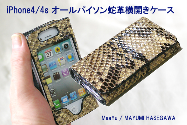 写真は、艶無垢の本蛇革です。今回発売のケースは、横開きでiPhone4/4sを