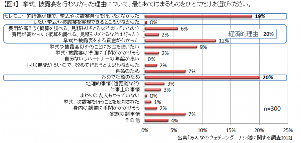 2011年の婚姻件数はおよそ67万組(厚労省 2011年 人口動態統計)、年間結婚式件数はおよそ35万組(経産省 2005年 サービス産業実態調査)と言われ、婚姻者の約半数近くがナシ婚(*入籍はするが、挙式・披露宴を行わない)層と言われています。ナシ婚に関する調査2012(みんなのウェディング調べ)によると、「経済的理由(20%)」 「おめでた婚(20%)」「セレモニーが嫌(19%)」が三大理由となっています【図1】。