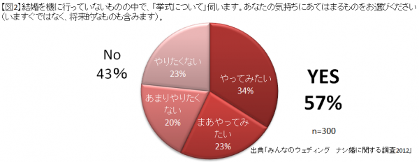 こうしたナシ婚層へ、結婚を機に行っていないものの中で、挙式について伺ったところ、「やってみたい」「まあやってみたい」という回答が、全体の57%を占める結果となりました【図2】。