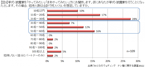 同調査では、結婚式(挙式、披露宴)を行った場合の「希望招待人数」を聞いたところ、「21名~30名」が28%と最も多く、傾向として、30名以下の層と、31名~60名の層が多くなりました【図3】。