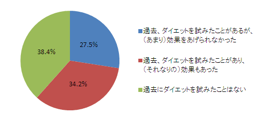 回答者全員に過去のダイエット経験を尋ねたところ、「過去、ダイエットを試みたことがあるが、(あまり)効果をあげられなかった」が27.5%と約4人に1人はダイエットの効果に満足をしていないことがわかった。