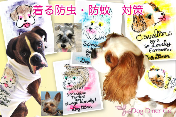 モスプルーフ素材を使用した犬用Tシャツに、愛犬のイラストとお名前を入れます。