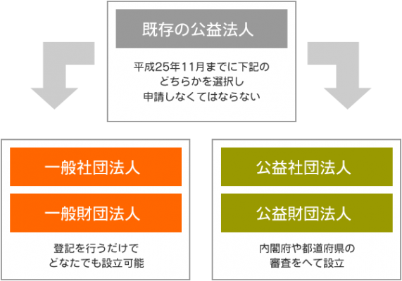 平成25年11月30日までに「一般社団法人」「一般財団法人」もしくは「公益社団法人」「公益財団法人」のいずれかに移行を申請しなければなりません。