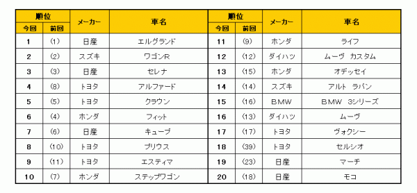 今月もエルグランドが首位を獲得&トップ3に動きなし!