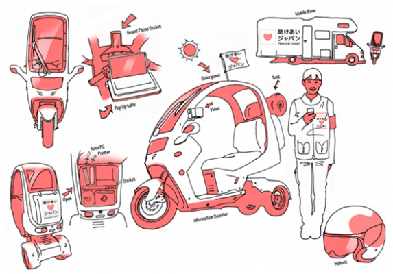 3.11の震災時、会社から一歩もでることができず、USTに再配信される洪水の前に人間の無力さと、その未曾有の震災からどのように立ち上がるのか、自分たちに何かできるのか想像も付かず、呆然とするなか、参加したボランティア「助けあいジャパン」の事務局の壁面に1枚の絵コンテが貼ってあり、震災地に、3輪バイクをベースにした中継システムがあれば、テレビ局の大型中継車が入ることが出来ないような現場からも、情報が発信できるのではないかというアイディアが、画にまとめられていました。