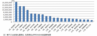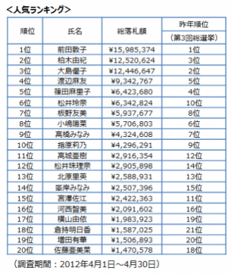 当社が提供している分析ツール「オークファンプロ」にて、調査を行った結果では、1位 前田敦子(15,985,374)、2位柏木由紀(12,520,624)、3位 大島優子(12,446,647)という結果となりました。
