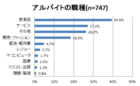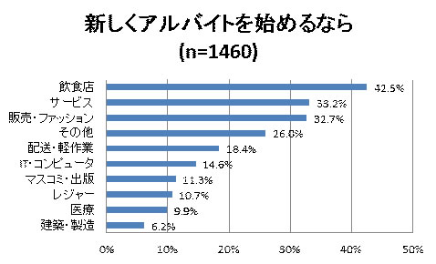 全国の大学生・男女11,460人に対して「アルバイト」についてモバイルリサーチを実施した。「新しくバイトを始めるならどの職種が良いか」を聞いたところ、全体で一番多かったのは「飲食店」(42.5%)であり、次いで「サービス」(33.2%)、「販売・ファッション」(32.7%)となった。全体の81.4%の学生にバイト経験があり、そのうちの63%が現在もバイトと学生生活を両立しているということが分かった。なお今回、大学種類をそれぞれモニターに聞き、それらがアルバイト事情にどう反映しているかも分析する。