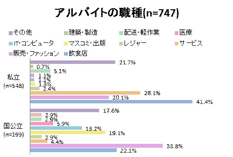 現在アルバイトをしている職種を大学種類別に比較すると、興味深い結果となった。まず、飲食店でアルバイトしている学生を比較すると私立(41.4%)と国公立(22.1%)で2倍近くの差があり、次にサービスで比較すると私立(28.1%)、国公立(4.4%)と私立が国公立を7倍近く上回ったのだ。対して、国公立学生が私立学生を上回って打ち込んでいる職種は、販売であることが分かった。(国公立33.8%、私立20.1%)上記3つの職種は現在働いている職種の全体ベスト3(飲食店39.5%、サービス27.2%、販売・ファッション18.3%)に該当するが、一方マスコミ・出版(1.2%)、IT・コンピュータ(1.7%)とコアな職種を学校種類別に比較すると、国公立学生がそれぞれの大半を占めていることが分かった。マスコミ・出版(国公立19.1%、私立1.3%)、IT・コンピュータ(国公立13.2%、私立1.1%)。マスコミ・出版、IT・コンピュータ関連の仕事と、接客を連想させる飲食店、サービス、販売・ファッションを比較すると前者の方が学問的知識を必要とするイメージは気のせいだろうか。一概には言えないが、「専攻がバイトに活かされているか」という質問に対して「活かされている」(国公立32.7%、私立22.1%)という答えが私立学生を国公立学生が上回ったことと、大学一般受験での受験教科が私立より国公立の方が通常多くあることからも分かるように、私立学生より国公立学生の方が幅広く知識を養い、それらをアルバイトに活かしているのかもしれない。
