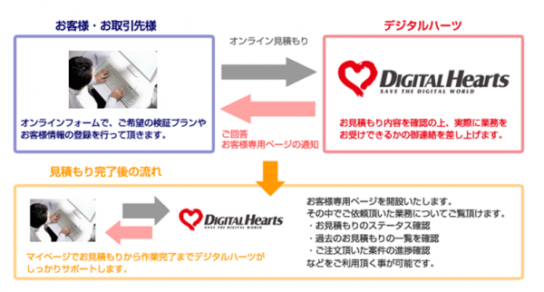 株式会社デジタルハーツ(本社所在地:東京都新宿区、代表取締役社長CEO:宮澤栄一、東証第一部:証券コード3620、以下、デジタルハーツ)は、クライアント様向けサービスの利便性向上及び効率化を目的に、モバイルコンテンツ及びWEBサイト・システム検証のお見積りやご発注がオンラインで簡単にできるサイト「オンラインエージェント」を平成24年5月21日にオープンいたしました。