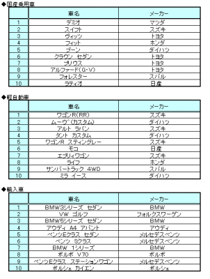 軽自動車部門では、1位ワゴンR(RR)(スズキ)、2位ムーヴ(カスタム)(ダイハツ)が3ヶ月連続の ワンツーフィニッシュとなりました! 比較的変動の少ない軽自動車部門ですが、今月は7位エブリィワゴン(スズキ)が前月22位から、 9位サンバートラック4WD(スバル)が33位から、10位ミラ イース(ダイハツ)が30位からと大きく ジャンプアップしています。